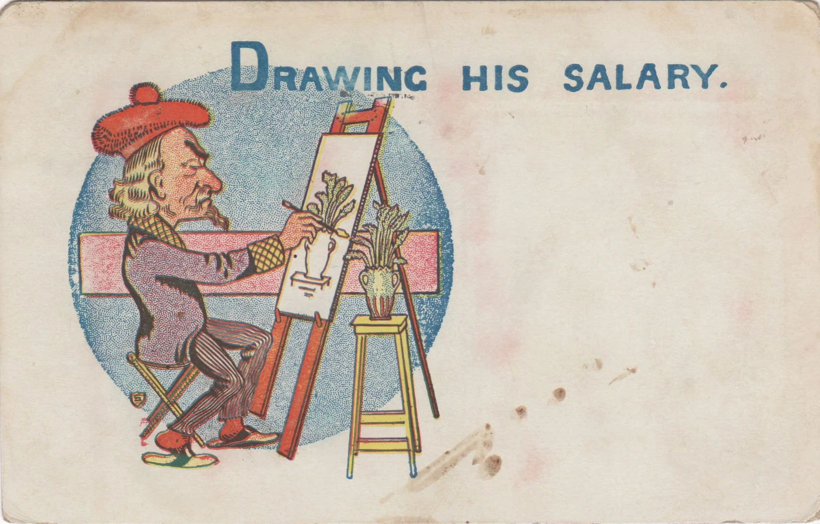 Here we have a cartoon postcard from 1908. It shows an artist sitting at an easel “Drawing His Salary”. Yes, I get the pun: he is both “drawing” with a pen or paintbrush and “drawing” (e.g. “taking”) a sum of money from the eventual sale of his artwork. I am often perplexed by vintage humor. Were some jokes and puns funnier to people 100+ years ago than they are to modern audiences?