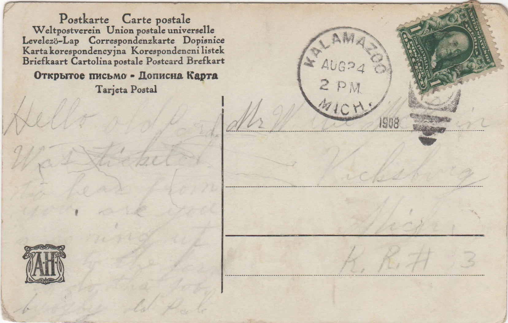 The address side of the postcard says that it was sent August 24th, 1908 from Kalamazoo, Michigan.